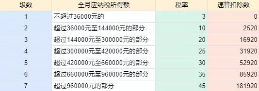 適用稅率:以全年一次性獎(jiǎng)金收入除以12個(gè)月得到的數(shù)額對(duì)照月度稅率表確定: